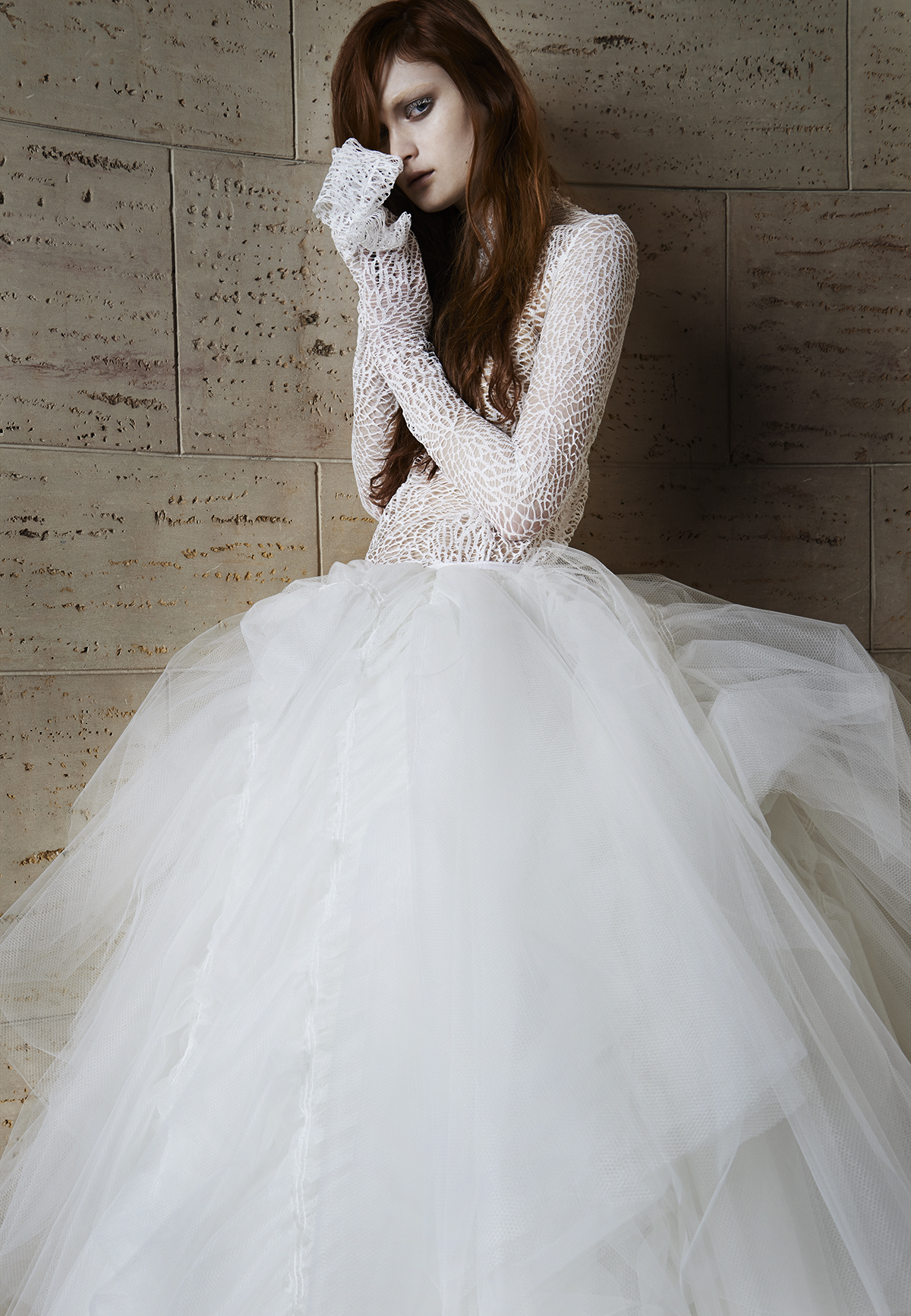 Look 15. Ivory web lace long sleeve blouse. Ivory tulle ball gown skirt with ruched details.
